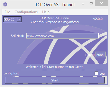 From this page, download the latest version of TCP Over SSL Tunnel, learn how to create working config files and use the knowledge to browse for free thoughtless of your region and ISP.